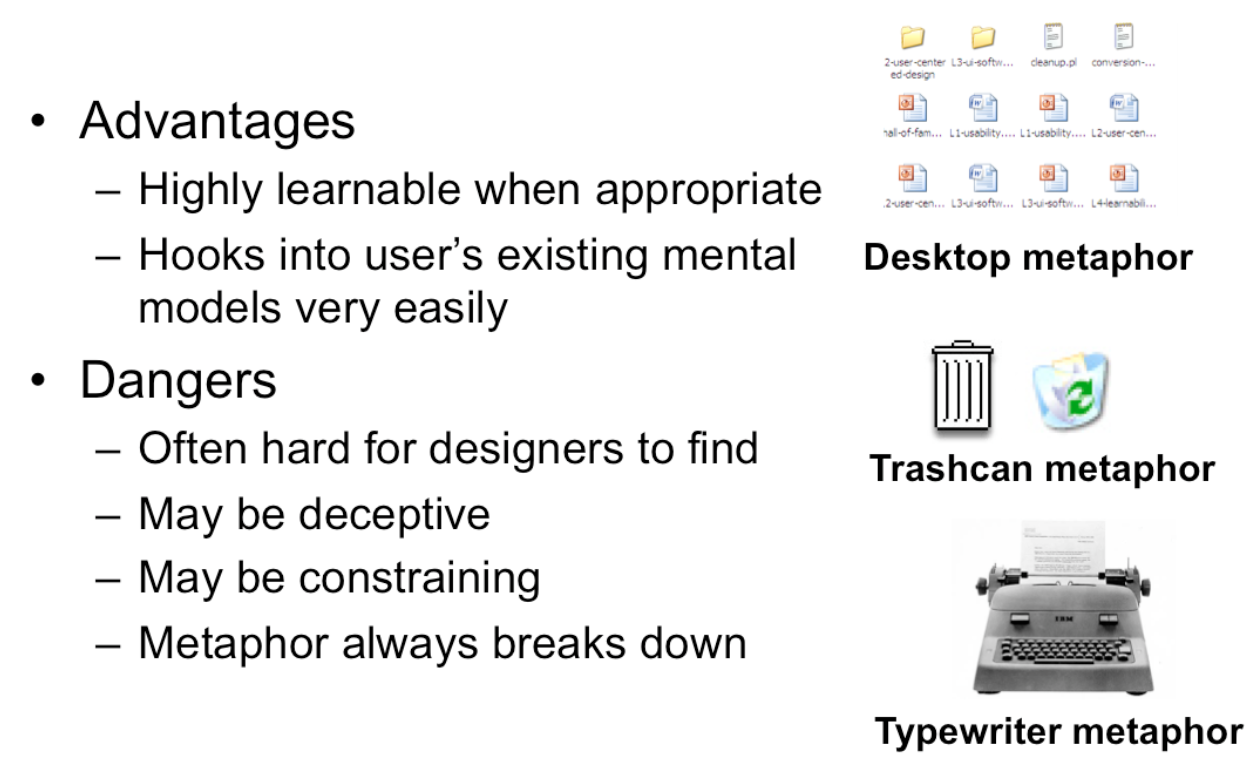 Each of these metaphors carries along with it a lot of knowledge about the parts, their purposes, and their interactions, which the user can draw on to make guesses about how the interface will work.