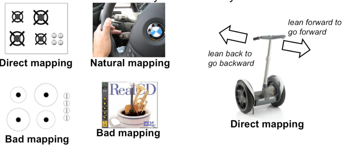 - An audio mixer for DJs (proposed by Max Van Kleek for the Hall of Fame) has two sets of identical controls, one for each turntable being mixed. The mixer is designed to sit in between the turntables, so that the left controls affect the turntable to the left of the mixer, and the right controls affect the turntable to the right. The mapping here is direct.