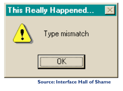 **External consistency** in wording is important too -- in other words, speak the user's language as much as possible, rather than forcing them to learn a new one. If the user speaks English, then the interface should also speak English, not Geekish. Technical jargon should be avoided. Use of jargon reflects aspects of the system model creeping up into the interface model, unnecessarily. How might a user interpret the dialog box shown here? One poor user actually read type as a verb, and dutifully typed M-I-S-M-A-T-C-H every time this dialog appeared. The user's reaction makes perfect sense when you remember that most computer users do just that, type, all day. But most programmers wouldn't even think of reading the message that way. Yet another example showing that you are not the user.