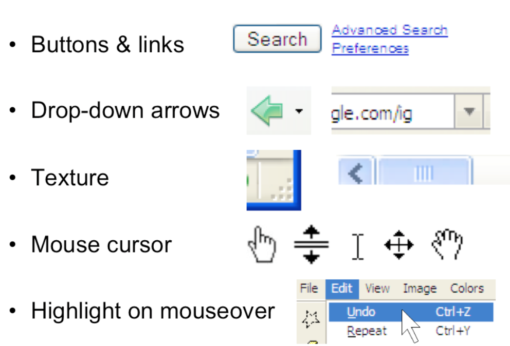Mouse cursor changes are another kind of affordance -- a visible property of a graphical object that suggests how you operate it. When you move the mouse over a hyperlink, for example, you get a finger cursor. When you move over the corner of a window, you often get a resize cursor; when you move over a textbox, you get a text cursor (the "I-bar").