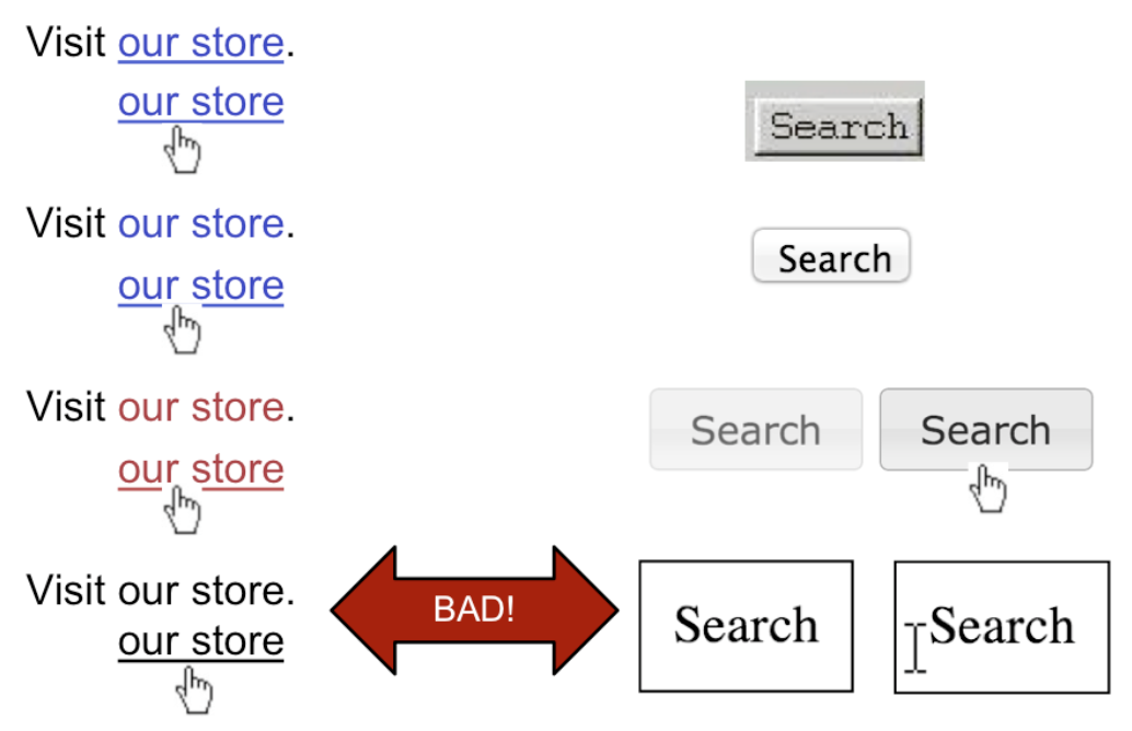 Hyperlinks and buttons have evolved and changed significantly. The top row shows how hyperlinks and buttons looked circa 1995 (on NCSA Mosaic, the first widely-used web browser, which used the Motif graphical user interface toolkit). What properties did they have that distinguished them and made them clickable? Which of those properties have been lost over time, presumably as users become more familiar with these objects? The drive toward simplicity is a constant force in aesthetics and user interface design, so affordances tend to diminish rather than increase.