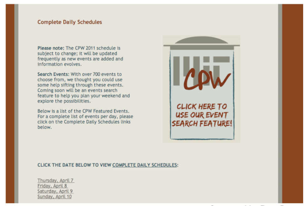 Here is the Campus Preview Weekend 2011 website. If the user wants an overview of all the events happening that weekend, the user may end up just clicking through the days individually, because those links (at the bottom) are the most salient affordances for interaction.