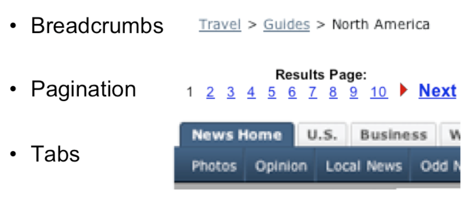 **Navigation** is one important kind of state to visualize -- i.e., where am I now? On the Web, in particular, users are in danger of getting lost as they move around in deep, information-rich sites. We've already seen in previous readings a couple of patterns for preventing this by visualizing the user's location. Breadcrumb trails show where you are as a path through the site's hierarchy (e.g., Travel > Guides > North America), in a very compact form. Showing the hierarchy in a tree widget with the current node highlighted is another way to do it, but costs more screen space and complexity. Pagination and highlighted tabs are similar patterns that show the user where they are, along with some context of where else they could go.