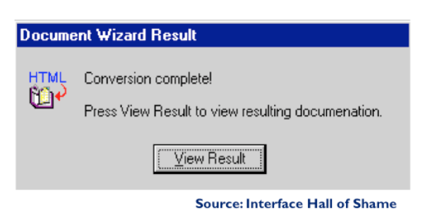 Feedback is important, but don't overdo it. This dialog box demands a click from the user. Why? Does the interface need a pat on the back for finishing the conversion? It would be better to just skip on and show the resulting documentation.