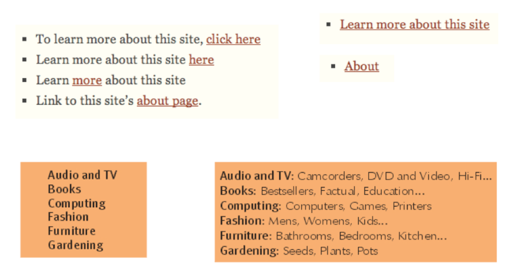 Notice that the quality of information scent depends on the user's particular goal. A design with good scent for one set of goals might fail for another set. For example, if a shopping site has categories for Music and Movies, then where would you look for a movie soundtrack? One solution to this is to put it in both categories, or to provide "See Also" links in each category that direct the user sideways in the hierarchy.