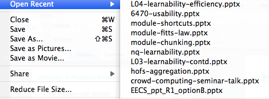 Many inputs exhibit temporal locality--i.e., the user is more likely to enter a value they entered recently. File editing often exhibits temporal locality, which is why Recently-Used Files menus (like this) are very helpful for making file opening more efficient. Keep histories of users' previous choices, not just of files but of any values that might be useful. When you display the Print dialog again, for example, remember and present as defaults the settings the user provided before.