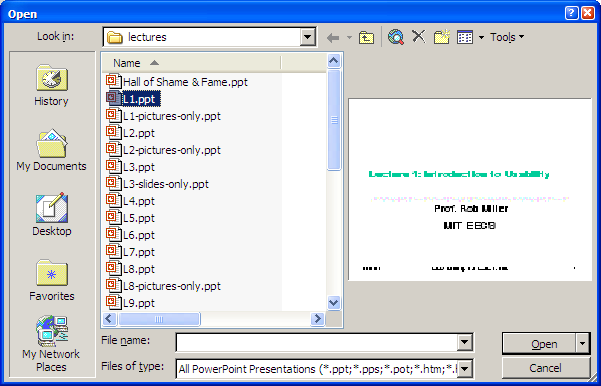For example, here's the File Open dialog in Windows XP. This dialog demonstrates a number of anticipations: