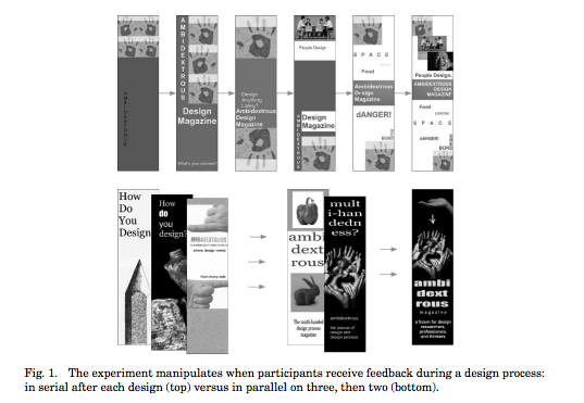 * For individual designers: designers produce designs that are more creative and divergent when they keep multiple designs around throughout the iterative process. They also feel more confident about their designs, and the resulting final design is objectively better. (Dow et al., "[Parallel Prototyping Leads to Better Design Results, More Divergence, and Increased Self-Efficacy](http://dl.acm.org/citation.cfm?id=1879836)," TOCHI, 2010).