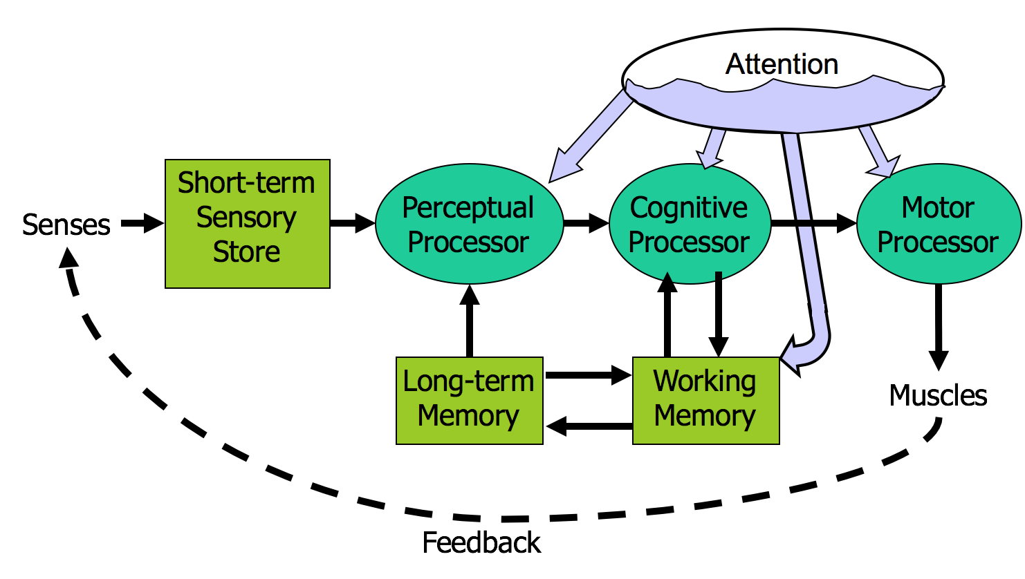 Finally, there is a component corresponding to your **attention**, which might be thought of like a thread of control in a computer system. Note that this model isn’t meant to reflect the anatomy of your nervous system. There probably isn’t a single area in your brain corresponding to the perceptual processor, for example. But it’s a useful abstraction nevertheless.