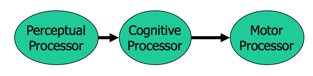 The **cognitive processor** takes the symbols recognized by the perceptual processor and makes comparisons and decisions. It might also store and fetch symbols in **working memory** (which you might think of as RAM, although it’s pretty small). The cognitive processor does most of the work that we think of as “thinking”.