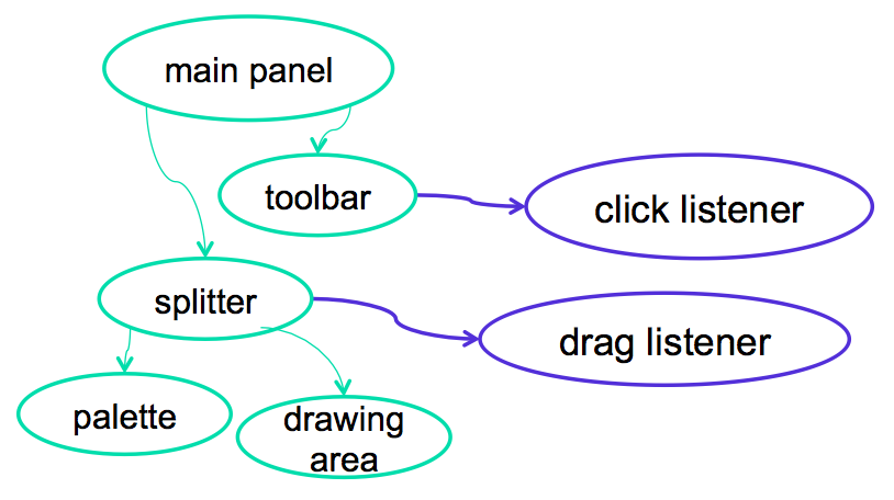 - To handle mouse input, for example, we can attach a handler to the view that is called when the mouse is clicked on it. Handlers are variously called **listeners**, event handlers, subscribers, and observers.
