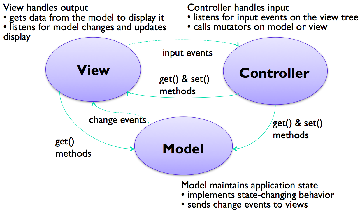 We've seen how GUI programs are structured around a view tree, and how input events are handled by attaching listeners to views. This is the start of a separation of concerns--output handled by views, and input handled by listeners.