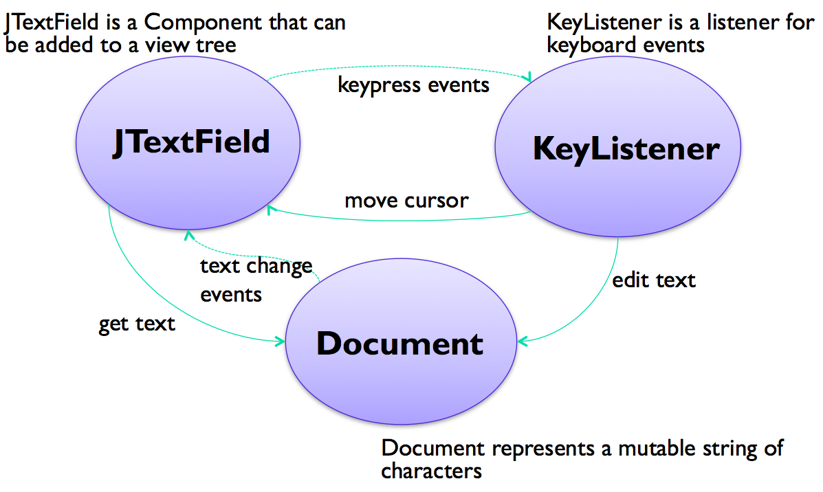 A simple example of the MVC pattern is a text field widget (this is Java Swing's text widget). Its model is a mutable string of characters. The view is an object that draws the text on the screen (usually with a rectangle around it to indicate that it's an editable text field). The controller is an object that receives keystrokes typed by the user and inserts them in the string. Note that the controller may signal a change in the view (here, moving the cursor) even when there is no change in the underlying model.