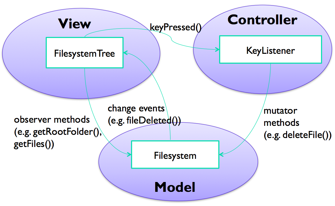 Here's a larger example, in which the view is a filesystem browser (like the Mac Finder or Windows Explorer), the model is the disk filesystem, and the controller is an input handler that translates the user's keystrokes and mouse clicks into operations on the model and view.