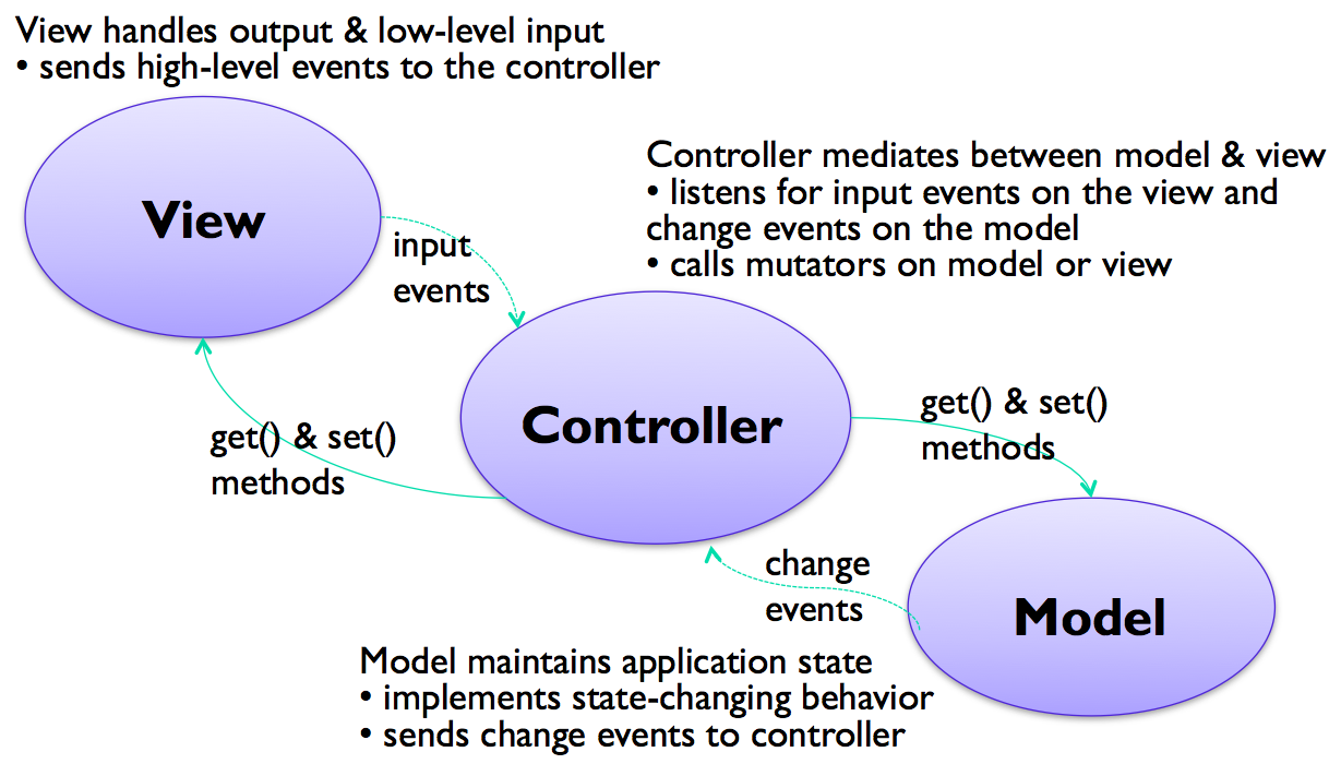 But listening to the model is no longer the view's responsibility. Instead, the controller listens to both the model and the view, passing changes back and forth. The controller receives high-level input events from the view, like selection-changed, button-activated, or textbox-changed, rather than low-level input device events.