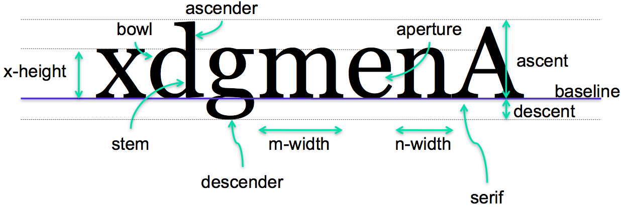 Now a few definitions. Characters in the Latin alphabet all sit on a common baseline. Some characters have descenders dipping below the baseline; others have ascenders rising above the typical height of a lowercase character (the x-height). Capital letters also ascend above the **x-height**. The typical height of ascenders above the baseline is called the **ascent**, and the typical height of descenders below it is called the **descent** of the font.