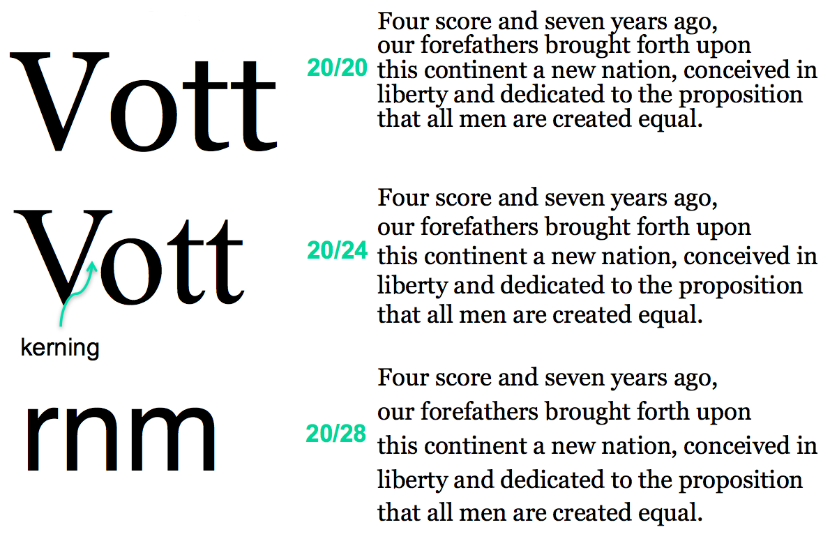 Several kinds of spacing matter in typography. At the lowest level is character spacing. The gaps between characters must be managed to prevent uneven gaps or characters appearing to run into each other. **Kerning** is the process of adjusting character spacing for *particular pairs* of characters; sometimes it needs to be narrowed (as V and o shown here), and sometimes widened (e.g., to keep "rn" from looking too much like "m"). Note that *kerning* is now widely misused to refer to **letter-spacing**, or **tracking**, which refers to the overall density of a set of words; use "kerning" to refer to the spacing between two individual letters. A good font has kerning rules built into it, and a good GUI toolkit uses them automatically, so this is rarely something GUI programmers need to worry about, except when choosing a font.