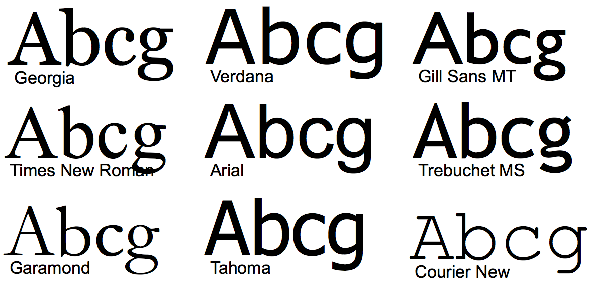After spacing, a key decision is what **typeface** to use. Typeface refers to a family of fonts sharing the same name, like "Arial" or "Georgia." A **font** is a choice of typeface and size and style, like roman, italic, oblique, boldface, etc.