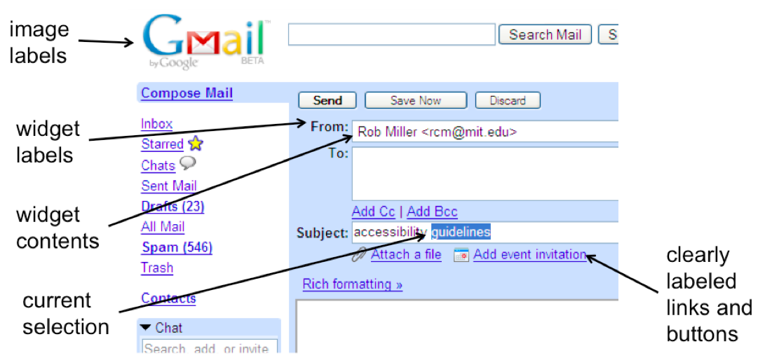 Widgets, like textboxes and checkboxes, should have labels associated with them. This association can't be merely visual (i.e. "From:" happens to be next to the textbox), but programmatically available to the screen reader, so that the screen reader can ask for the label of that textbox and get "From address" or something similar back. The interface that screen readers use to access this information is called an "accessibility API"; we'll talk about the APIs for Java and HTML later in this reading.