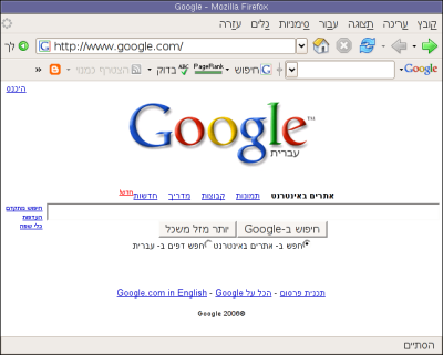 Many scripts are not even written left-to-right; Arabic and Hebrew are the most common languages with scripts written right-to-left. CJK (Chinese, Japanese, Korean) characters are usually written left-to-right, but can also appear vertically (top-to-bottom) and occasionally even right-to-left. Reversing the direction of reading requires reversing the entire layout of your screen, since the user is now accustomed to starting from the right edge when they scan. It might even affect the "natural" direction of arrow icons. The picture above shows the Hebrew version of Firefox. Notice that the menu bar is reversed (it starts from the right, and the rightmost menu is the File menu), the toolbar is reversed, and the Back button (which is now the rightmost button) is now pointing to the right! The URL box isn't reversed, however, because it uses the Latin alphabet, not Hebrew. This is another common wrinkle in right-to-left languages: when they embed foreign words, or Arabic numbers, the embedded words go in left-to-right order. So the text might be constantly switching direction.